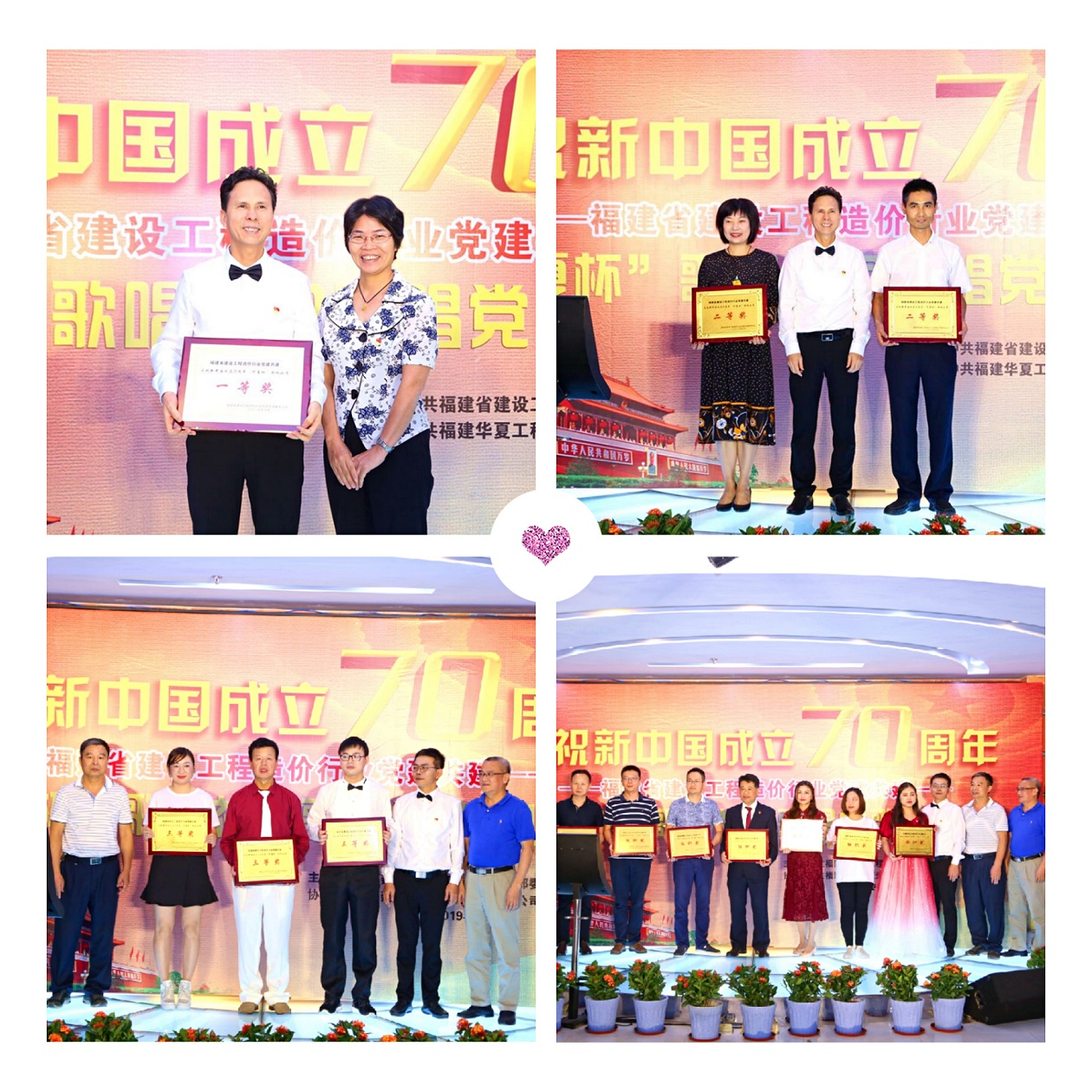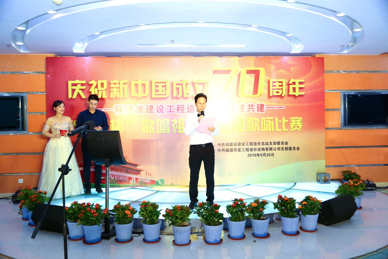 为庆祝中华人民共和国成立70周年,展现造价人不忘初心、奋勇拼搏的雄心壮志,福建省建设工程造价行业13家党建共建单位于9月26日下午,在省直机关工会活动大厅,隆重举行“‘华夏杯’歌唱祖国歌唱党”歌咏比赛。本次歌咏比赛由中共福建省建设工程造价总站支部委员会主办、华体会官方版网站登录入口-华体会(中国) 党支部协办。省住建厅机关党委专职副书记卢文英等领导亲临现场指导。