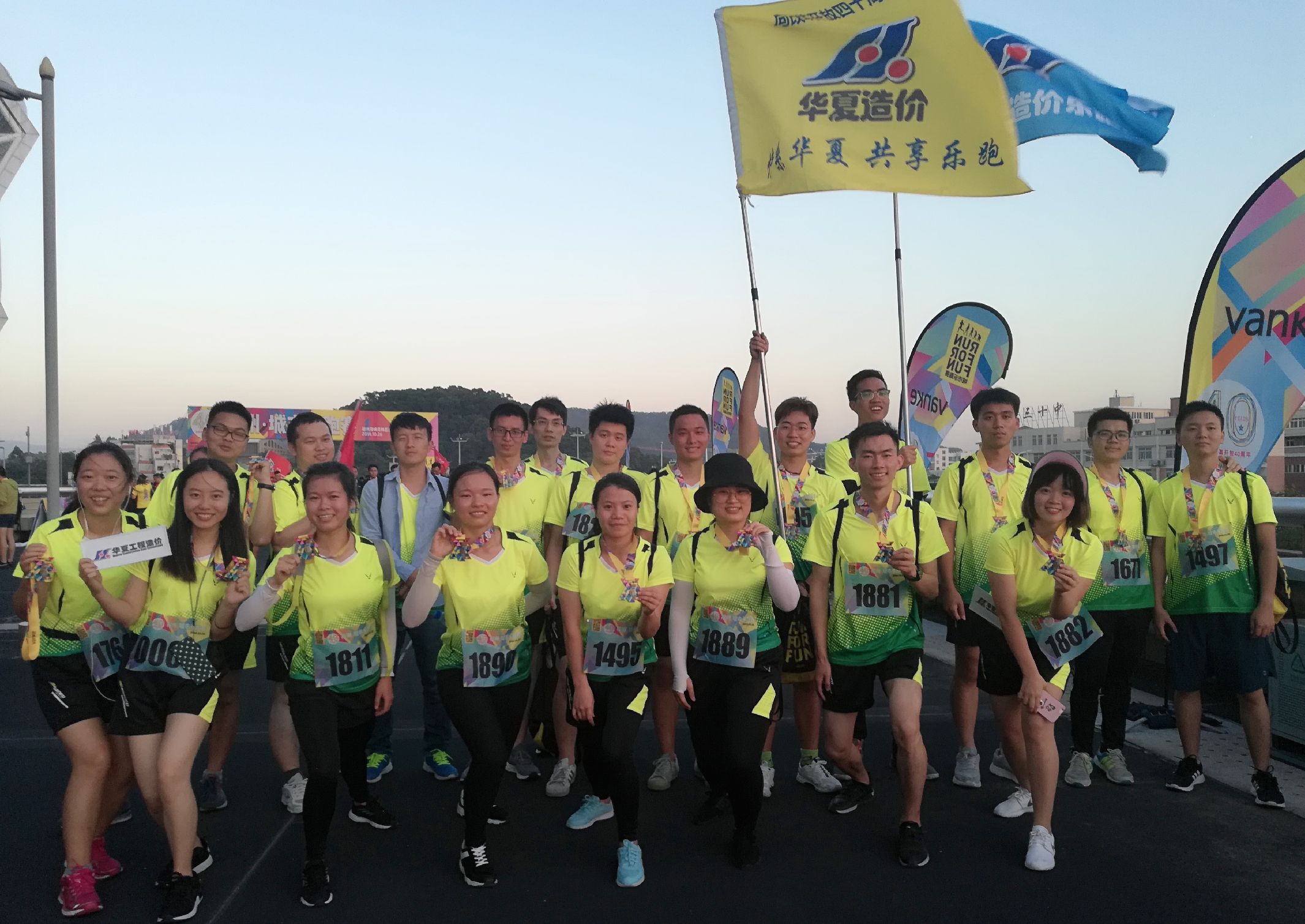 下午14:30,华夏乐跑团正式入场。秋高气爽,每个人的脸上都洋溢着灿烂与期待的笑容。奥体中心人山人海,远远的就能看见华夏造价那随风招展的旗帜。